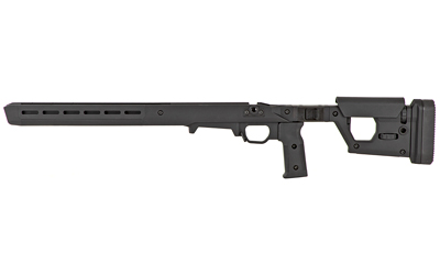 The Magpul Pro 700L Rifle Chassis is an uncompromising, full featured precision rifle chassis for long action Remington 700 and Remington 700-footprint rifles. The Pro 700L combines innovative engineering, precision machining, Mil-Spec quality finishes, and an extensive list of purposeful design features with complete adjustability to provide demanding end users with the most comprehensive available precision rifle platform solution for true out of the box performance. Based on a fully machined aluminum skeleton and clad in Magpul polymer for environmental comfort, noise mitigation, and ergonomics, the Pro 700L is also fully ambidextrous. Capable of fitting both right and left-handed actions with the simple swap of a bolt-cutout plate, it also includes a reversible cheek riser and overall length of pull adjustment range of 13.25 to 15.125″. Compatible with most long action AICS pattern detachable box magazines.